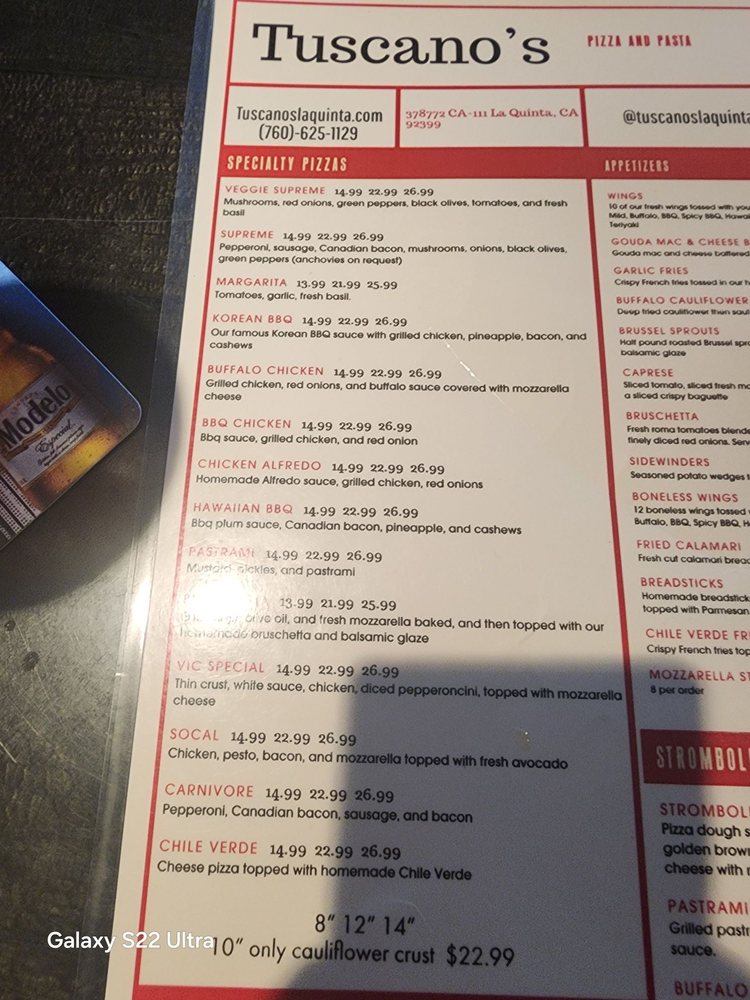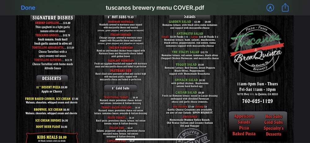 Tuscano’s & Brewquinta is a delightful gem located in La Quinta, CA, offering a rich Italian dining experience centered around their artisanal pizzas and hearty comfort dishes. With a diverse menu that includes spicy gnocchi, delectable lasagna, and flavorful wings, they cater to all palates, including vegan and vegetarian options. The inviting atmosphere is perfect for families and groups, complete with outdoor seating and a lively bar scene. Customers rave about the warm service and the quality of the food, making Tuscano’s a beloved dining destination for both locals and visitors eager to savor authentic Italian cuisine.
