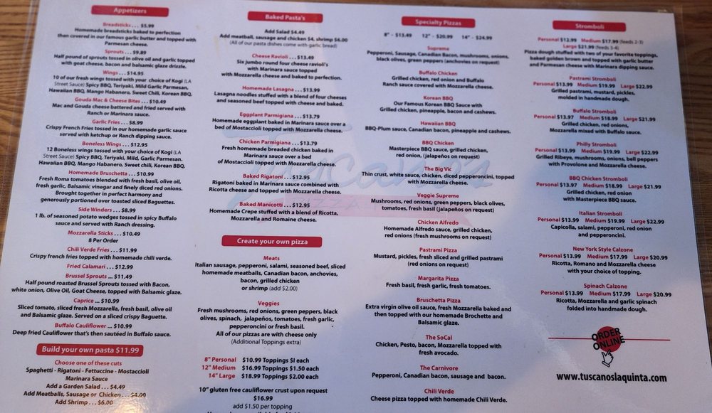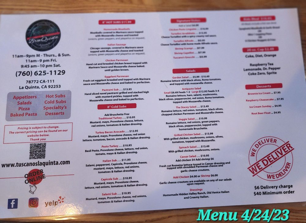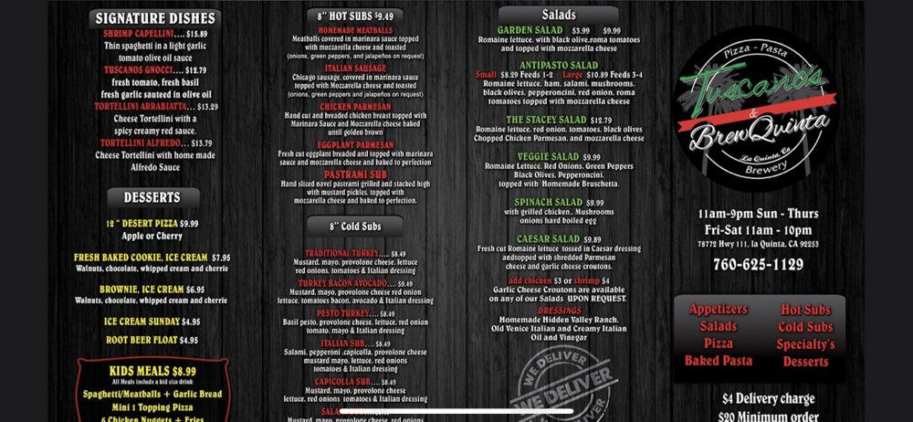 Welcome to Tuscano’s & Brewquinta, a culinary gem nestled in the heart of La Quinta, California. This Italian eatery specializes in pizzas that transport you straight to Italy with every slice. Their inviting atmosphere makes it a perfect spot for all — whether you're dining in, taking out, or enjoying the convenience of delivery.